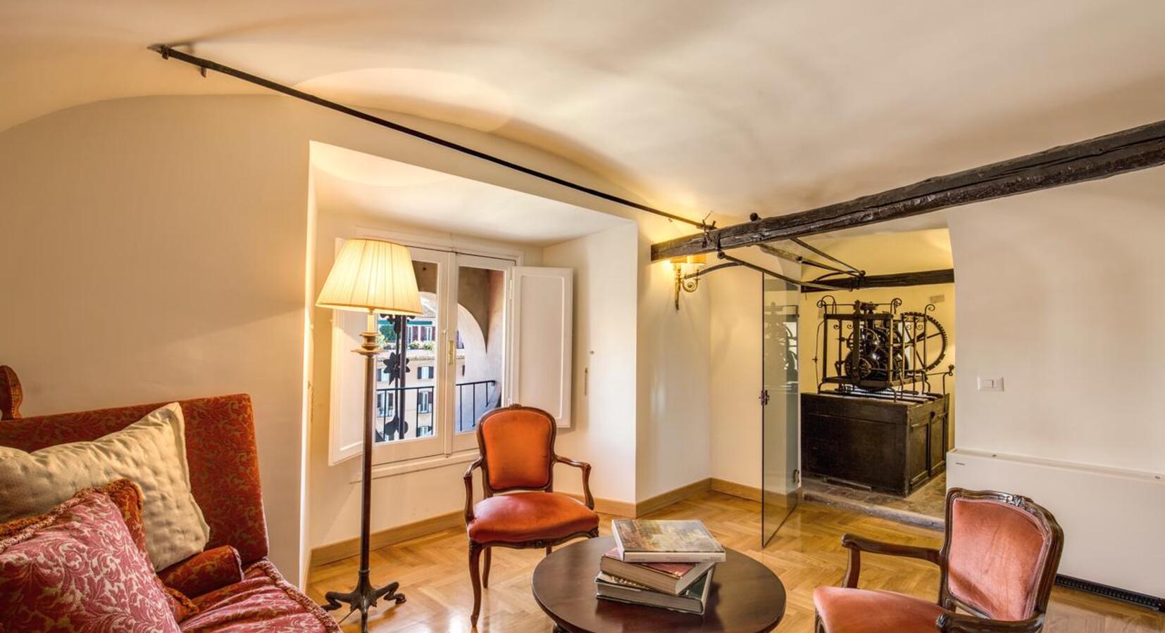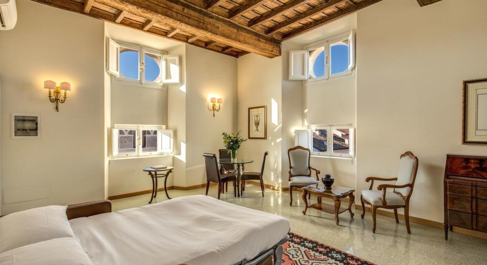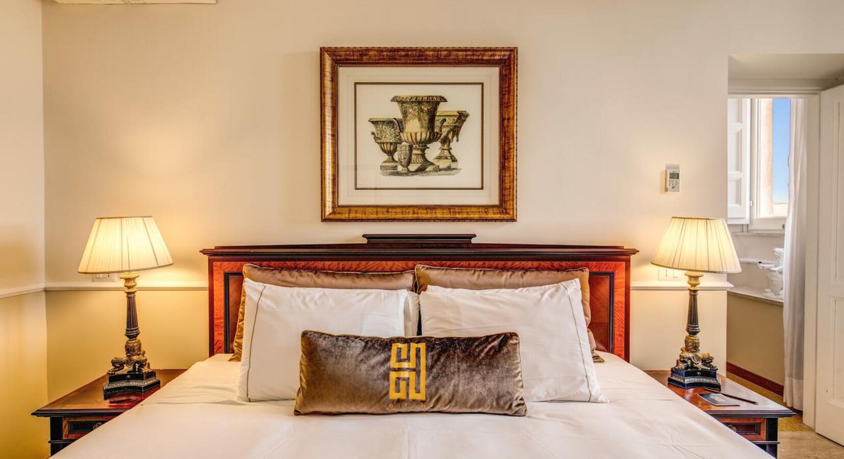 Liebhaber italienischer Architektur brauchen nicht weiter zu suchen - Ihr Traumhotel ist hier. Das Eitch Borromini liegt an der Piazza Navona und bietet einen atemberaubenden Blick auf einige der berühmtesten Sehenswürdigkeiten Roms. Das Hotel befindet sich im Pamphilj-Palast, der 1654 von Barockmeister Francesco Borromini entworfen wurde. Es gibt viele Originalmerkmale, von der dramatischen Treppe und den hohen Decken bis hin zu den Terrakottaplatten. Die Suiten gehen von einem Flur mit rotem Teppichboden ab, der mit Kunstwerken und frischen Blumen geschmückt ist. Die Zimmer sind im Stil der Zeit eingerichtet, mit vergoldeten Kopfteilen, bemalten Decken und Plüschbettwäsche. Im vierten Stock beherbergt das Hotel seine eigene private Kunstgalerie, die sich neben der Bar und dem Restaurant auf dem Dach befindet. Von der Terrasse aus hat man einen wunderbaren Blick über die Piazza und das historische Rom. Insgesamt handelt es sich um ein elegantes, historisches Hotel mit einem magischen Flair, das Sie bei einem Aufenthalt in die Vergangenheit entführt.