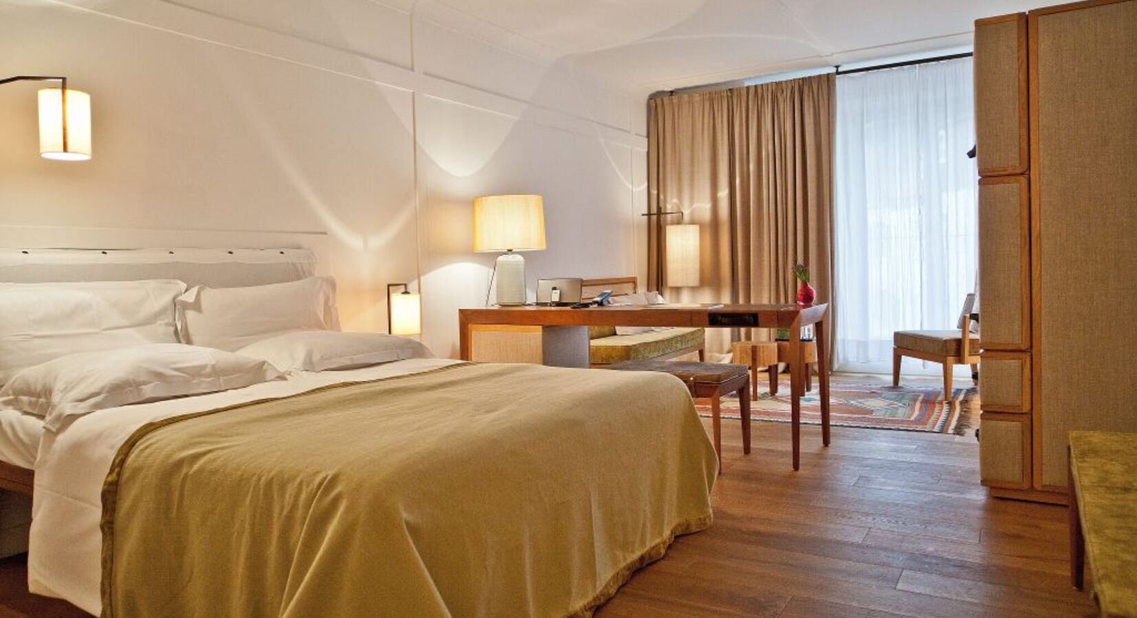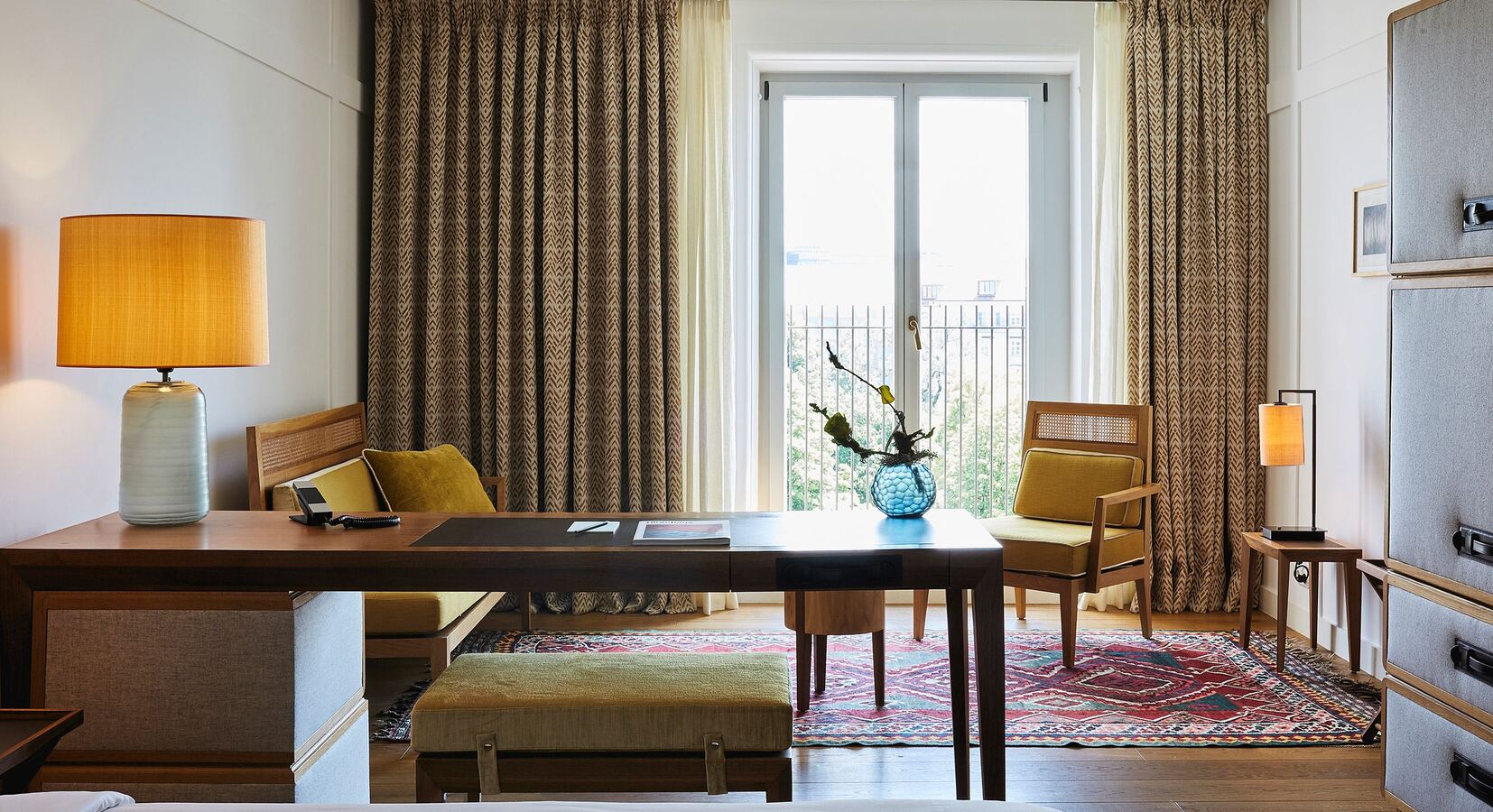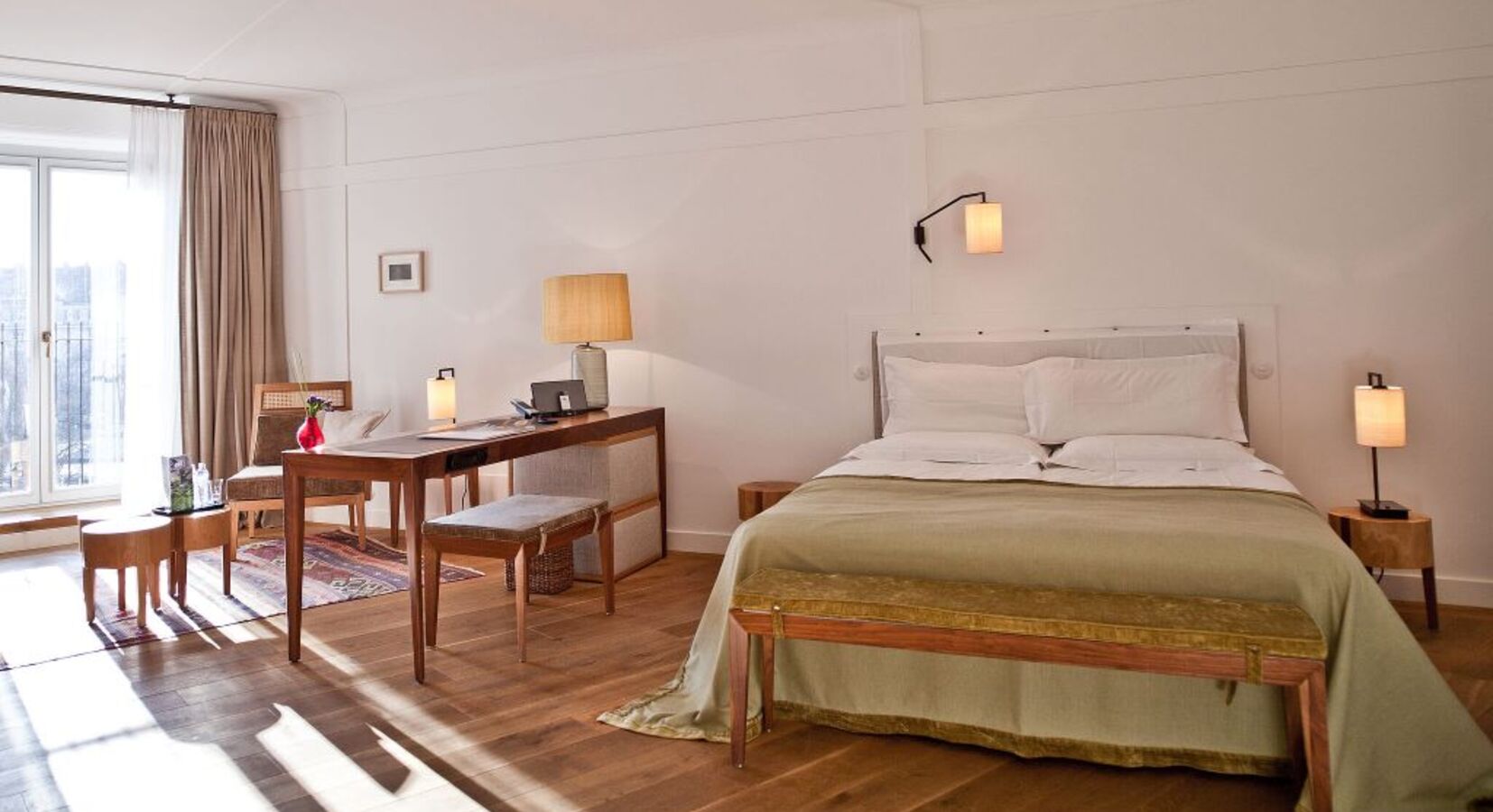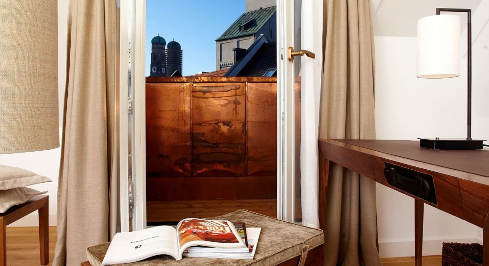 Dieses liebevoll gestaltete Hotel spiegelt seine Lage perfekt wider, aber um noch mehr Münchner Flair zu erleben, sollten Sie die doppelt verglasten Fenstertüren öffnen und den Trubel der Stadt auf sich wirken lassen. Die Wärme des Sonnenlichts, der Duft der Kräuter von den Marktständen auf der anderen Straßenseite und das erhebende Läuten der Glocken der mächtigen Heilig-Geist-Kirche aus dem 14. Jahrhundert über den Dächern.
