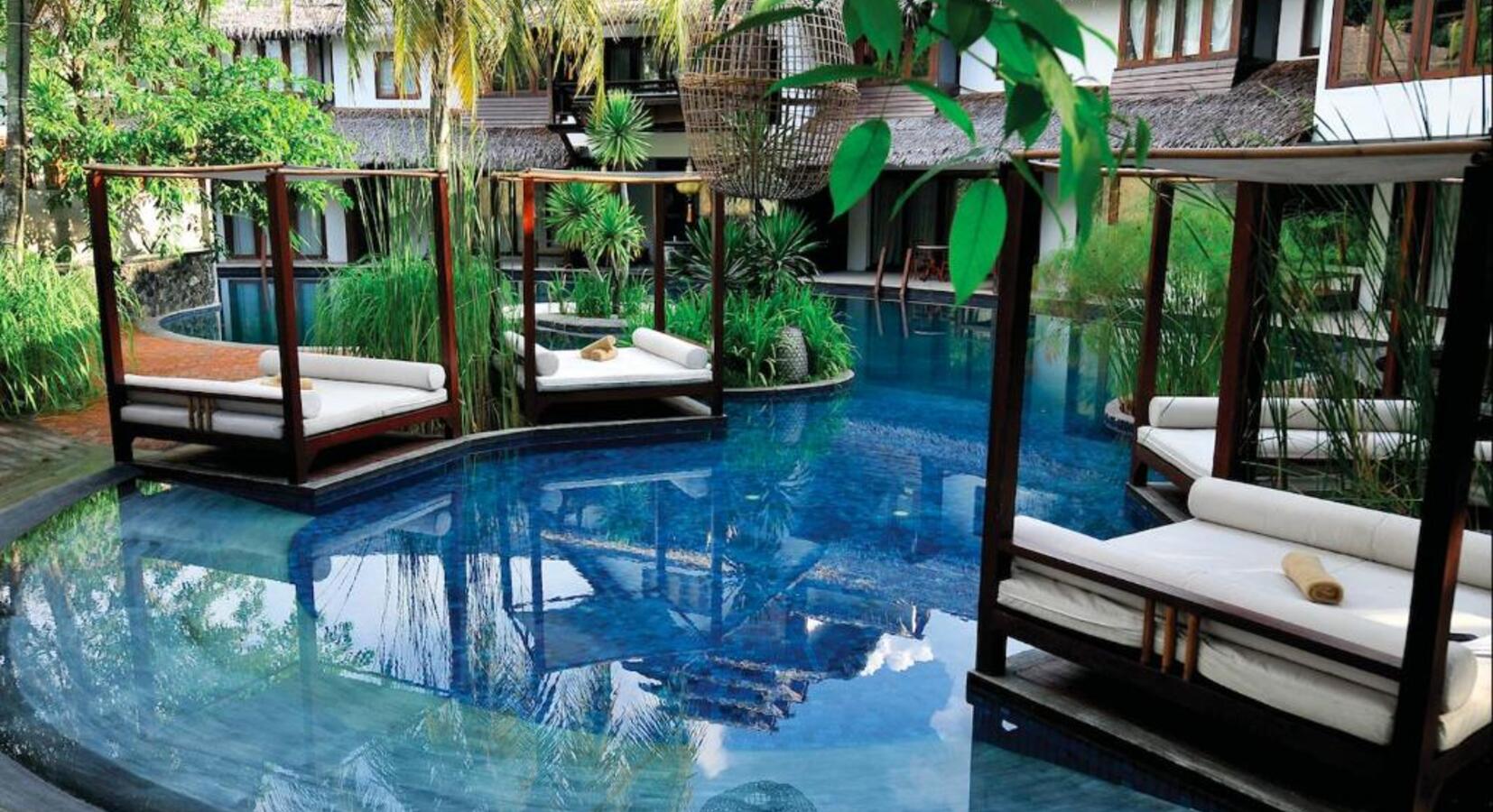 Fantastischer Pool im Lagunenstil, umgeben von tropischen Cabanas, in denen man sich entspannen kann.Restaurant