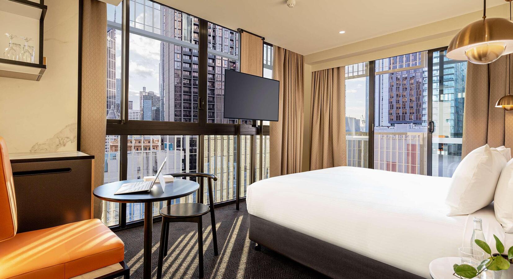 “A 20-floor tower in the heart of Melbourne's CBD, this slick yet affordable hotel has contemporary interiors with crisp white linens, city views & lots of light. Business rooms come with desks; studio apartments have kitchenettes & guests share access to a great gym. Super central, simple & stylish.”