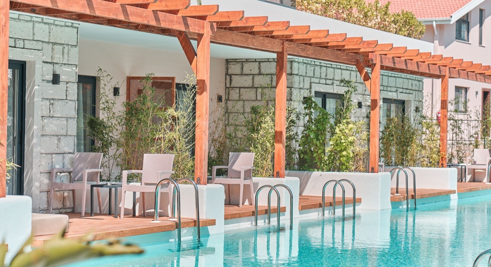 Outdoor pool with sun loungers and a poolside barOutdoor dining