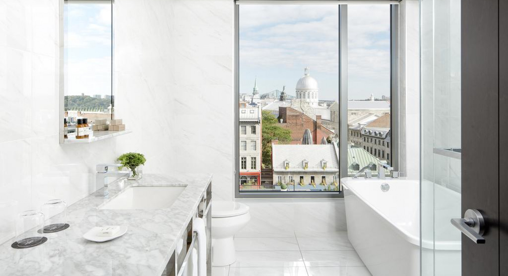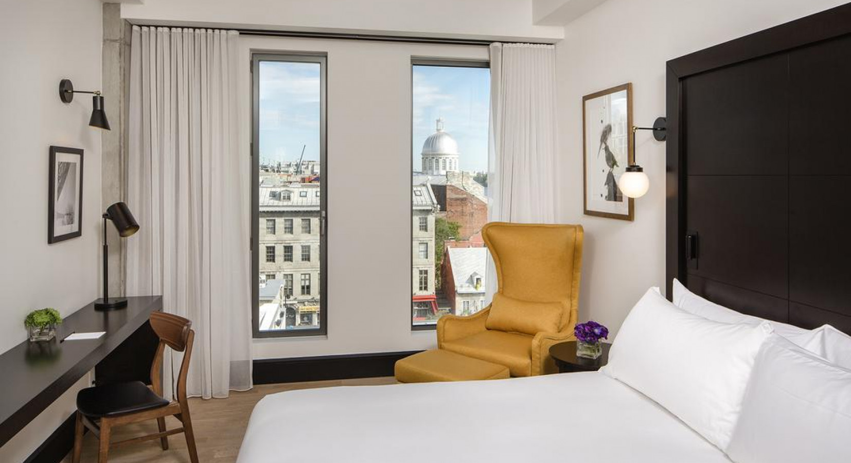 "The hotel is a progressive fusion of a stone house from the 1700s and a glass tower of 2016, serves terrific food and great drinks, and opens onto Place Jacques Cartier, where lively street life brings together locals and tourists."