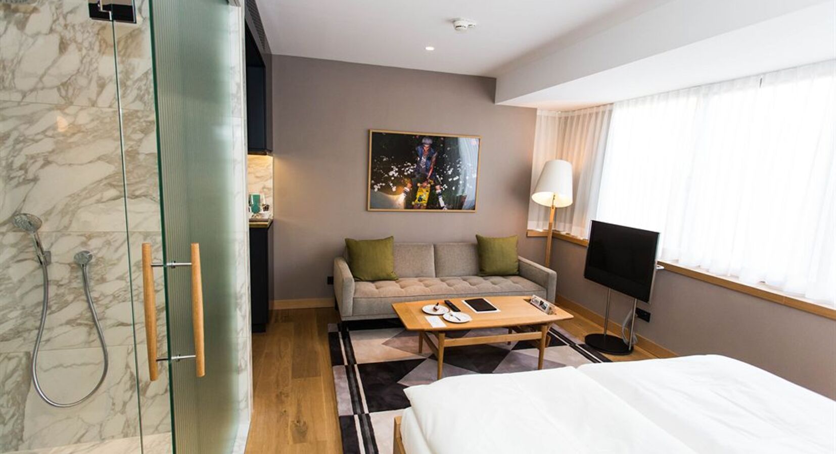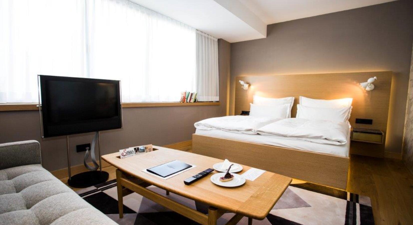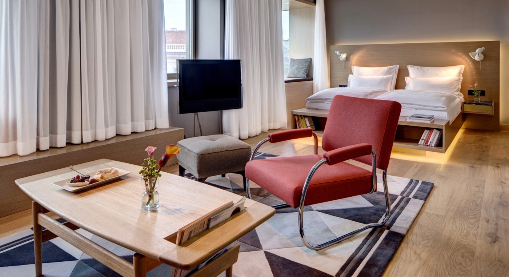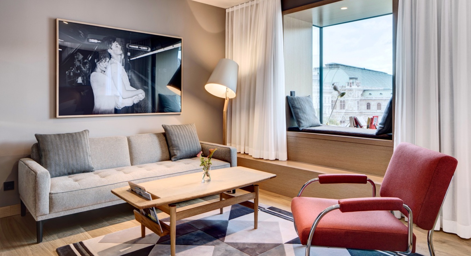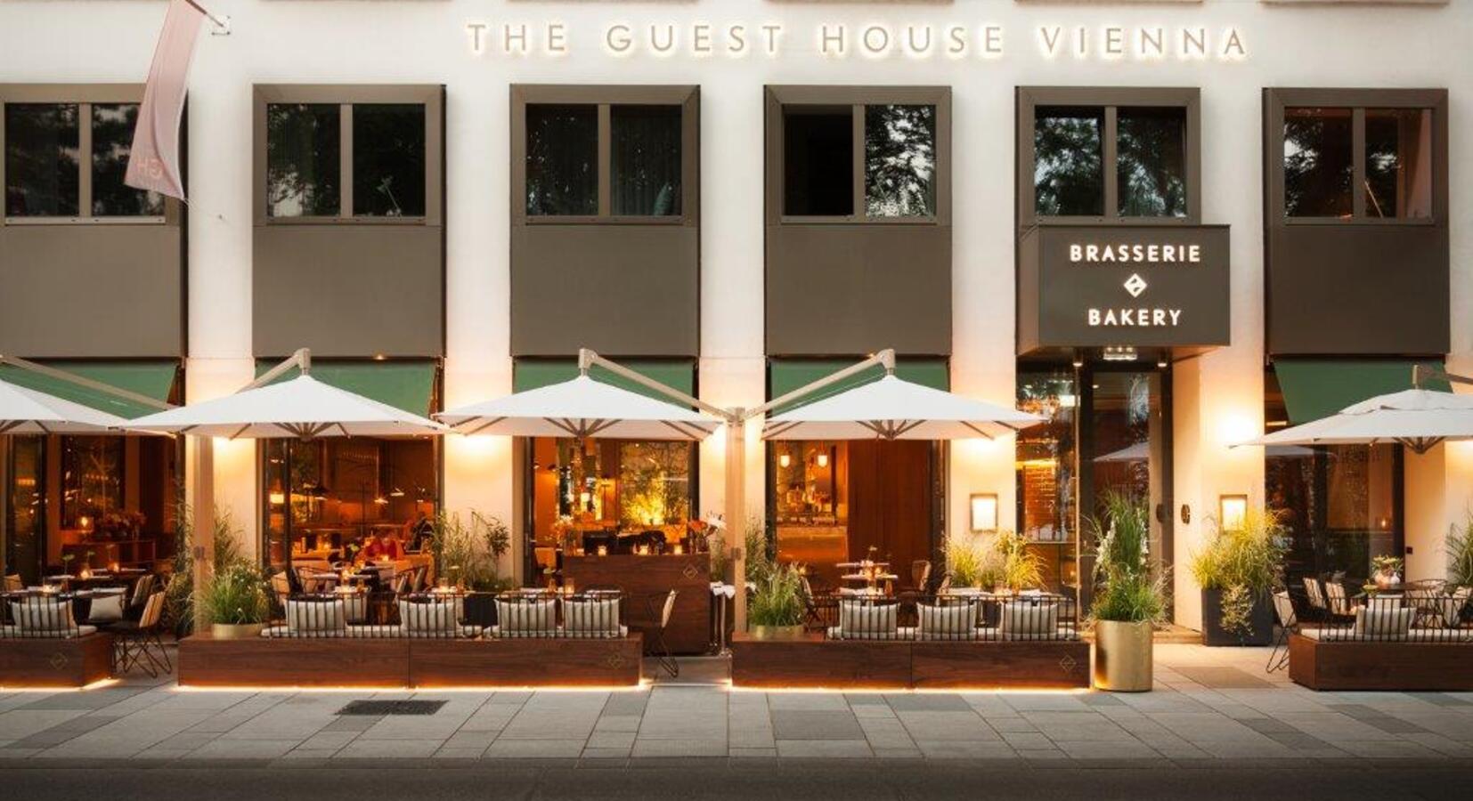A cosy, classy ‘concept’ hotel with 39 rooms in the very heart of Vienna’s central district, immediately opposite The Opera House, and a stone’s throw from the must-see Albertina museum. There is a definite philosophy at play here which is perhaps understandable when you learn that the interior design is by Conran & Partners and was closely over-seen by Sir Terence himself. The rooms are all about tranquillity and calm. Pared down, fuss-free, simple, modern, comfortable and elegant. The cleverly incorporated bathrooms continue this theme, whilst zesty and delicious own-brand toiletries (all natural of course) provide the ultimate pampering finishing touch. The best thing of all are the window seats where you could be forgiven for lolling all day looking out onto Vienna’s Baroque splendour – easily done as every room comes with 4 complimentary bottles of wine (or equivalent soft drinks), from the hotel’s own vineyard. You are allowed to take this to the Brasserie. What a great idea! The (delicious) house brand Arabica coffee is also complimentary in every room. Large-scale original photographs by Wolfgang Zac add a certain urban edginess to the rooms and public spaces. (The photographs were commissioned specially for this project). The light and spacious Brasserie on the ground floor is atmospheric, vibrant and buzzing. It is packed at lunchtimes and is a local hotspot for weekend brunches. Fresh seasonal cooking and home baked bread is the order of the day and you can sit out on the pavement in the summer. To quote Sir Terence himself “Good design makes people happy” and this is certainly borne out at The Guest House. Very highly recommended.