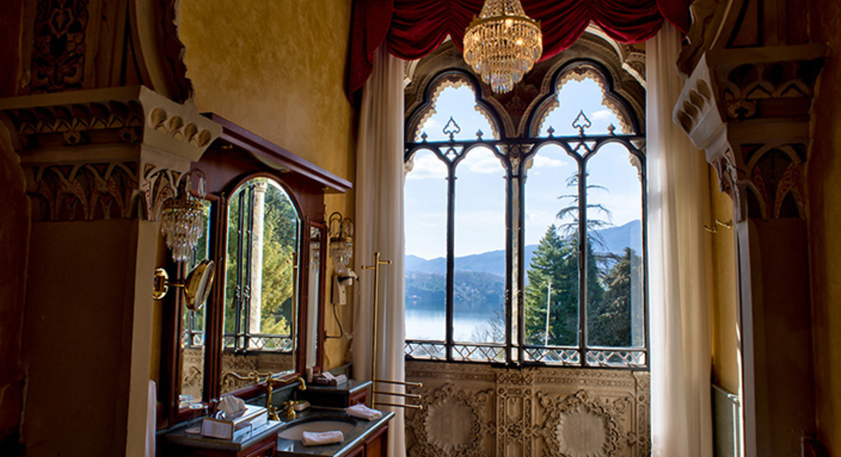 Villa Crespi is a very special spot - Arabesque architecture in this Moorish villa, award-winning restaurant, and beautiful gardens running down to the water's edge. 6 bedrooms and 8 suites in traditional style and opulent with their four poster beds, shiny walnut floors and chandeliers. Lots to do on the water or in the countryside surrounds. It's very romantic and lavish without being over the top.