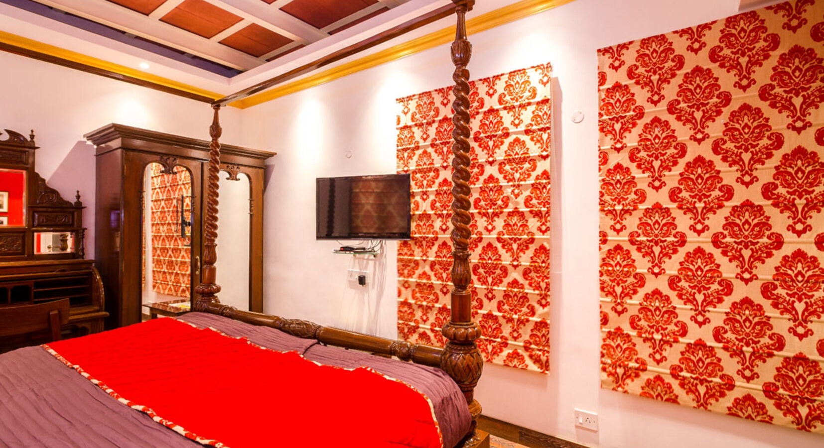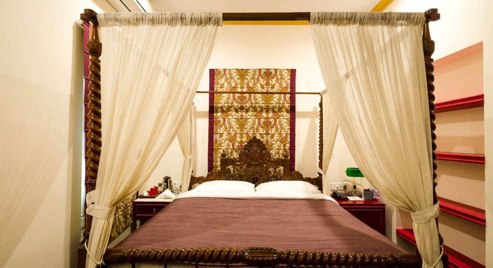 Situé sur la rue animée Sarat Bose Rd, on pourrait s'attendre à ce que cet hôtel chic soit bruyant, mais à l'intérieur, c'est un havre de paix élégant. Tout dans ses intérieurs est conçu pour évoquer l'effervescence de Kolkata. Les sept chambres portent des noms de couleurs : par exemple, Crimson reflète la brique rouge du Writer's Building et de la place Dalhousie, et Viridian reflète les jardins botaniques de la ville et le Royal Calcutta Golf Course. Les lits à baldaquin, les poignées de porte et les cadenas ornés témoignent de la grandeur de l'époque coloniale britannique. Les différentes teintes se retrouvent dans tous les aspects des chambres : les tables latérales, les stores, les tapis et les tableaux qui tapissent les murs de la chambre Indigo sont d'un violet profond. L'hôtel est surtout connu pour son restaurant, qui sert de délicieux mocktails (sans alcool) et des plats occidentaux bien présentés, comme les mini-tartelettes au gruyère et le filet de bhetki cuit au four dans une sauce à la moutarde et au citron. Son sol en damier, ses lustres bling-bling et ses murs rouge rubis décorés de photographies de Kolkata, d'horloges anciennes, de clés, d'écrous, de boulons et de poignées de porte créent une atmosphère amusante et excentrique. Il existe même un "menu pour les noctambules" en cas de petit creux, qui propose des grignotages tels que le "nut case", un assortiment de noix, d'amandes et de noix de cajou.