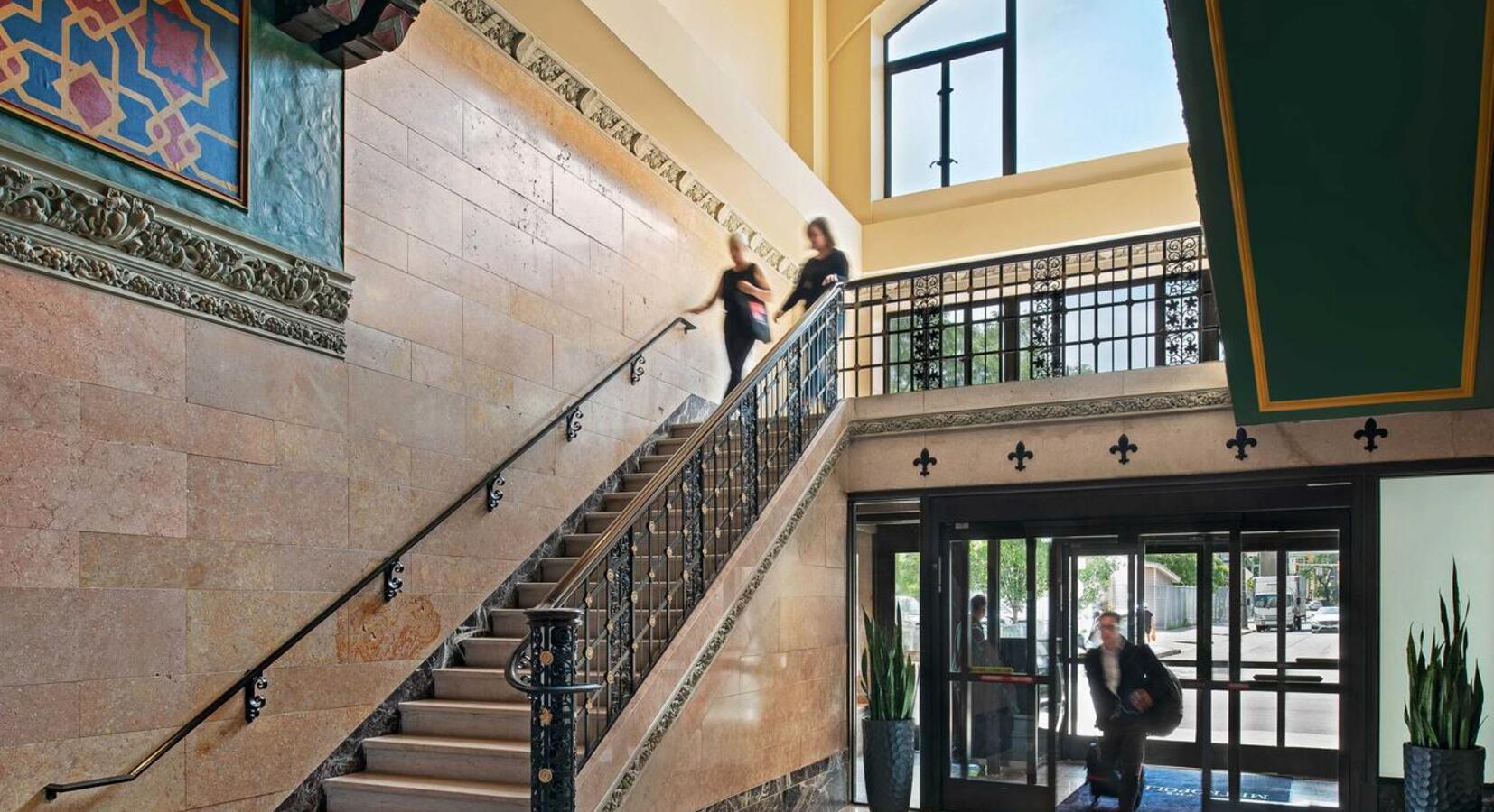 “Luxurious downtown hotel that blends monumental historic architecture with sleek contemporary interiors. Relaxed and spacious rooms, suites and studios with city views feature wooden floors, blonde furnishings and feature walls. Walk to restaurants, nearby pool and sites. Perfect mix of old and new.”
