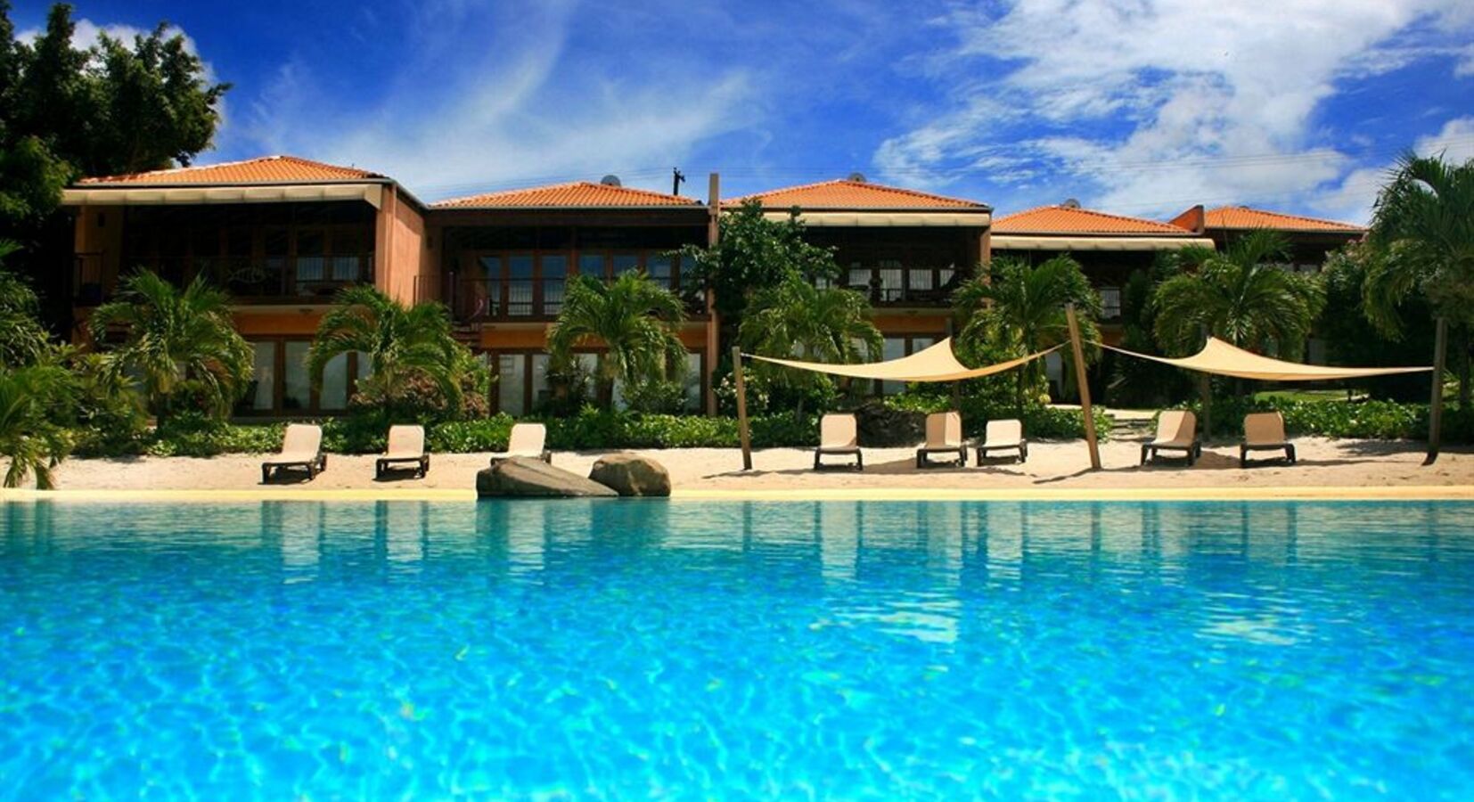 (Go) for everything but the beach. True Blue Bay has colourful, stylish bedrooms, a popular and often lively bar and restaurant on a deck projecting out over the water, and a well-regarded dive centre. But it has no proper beach - though one of the two appealing swimming pools is bordered by a little strip of man-made sand.