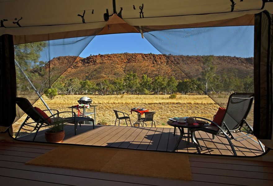 Three eco-tents offer an immersion into the Central Australian wilderness on the edge of the Western MacDonnell Ranges. Tents with en-suite bathrooms feature cosy double beds — or 3 singles — topped with patterned quilts & facing mountain-view decks. Evening BBQs & campfires are very special.