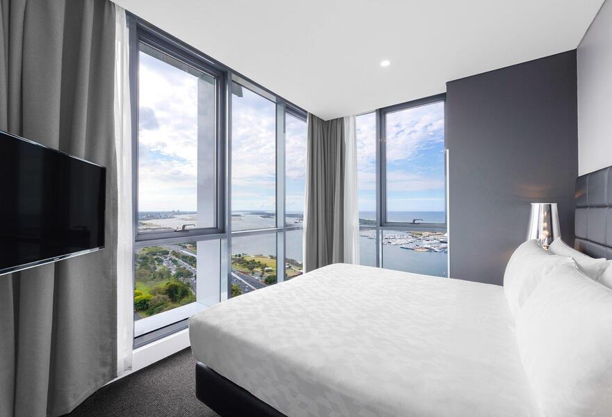 A collection of smart modern suites with up to three bedrooms in a Gold Coast high-rise. Expect stunning coastal & city views from white & charcoal bedrooms, sitting rooms & kitchens. There are indoor & outdoors swimming pools, too. A stylish urban base with great rates in a lively part of the city.