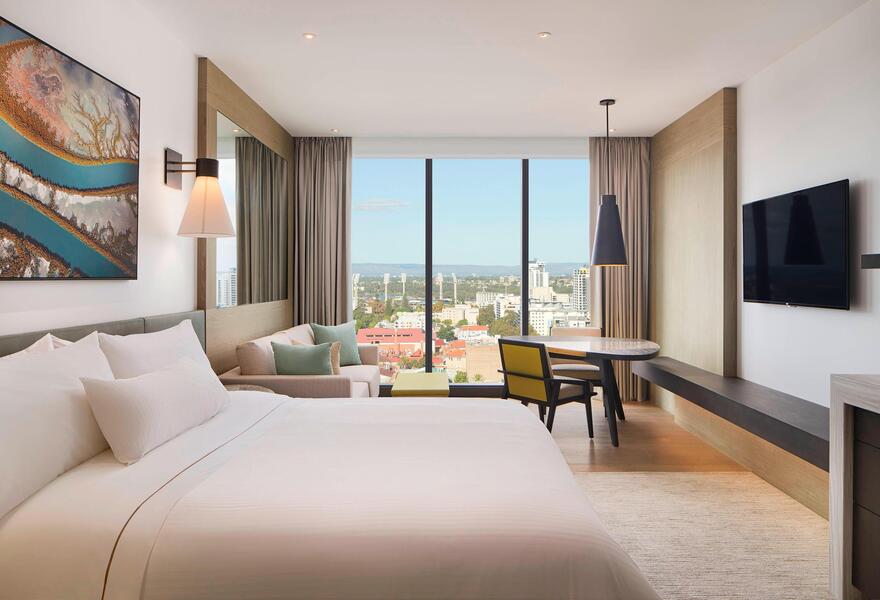 Cet hôtel urbain élégant se trouve sur Hibernian Place, dans le centre de Perth. Les chambres lumineuses sont dotées de grands lits recouverts de draps blancs, de photographies de l'Australie occidentale et de salles de bains luxueuses. Une piscine à débordement au cinquième étage, un restaurant italien gastronomique et un spa apaisant complètent le tableau. Élégant et luxueux.