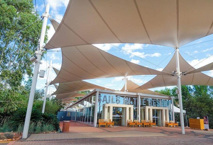 Part of the expansive Ayers Rock Resort, Sails in the Desert is a luxurious hotel with an impressive collection of Aboriginal artwork. Spacious rooms & suites have whitewashed walls, patterned textiles & modern bathrooms. There's an onsite gallery, spa, tennis court, pool & two eateries, too.