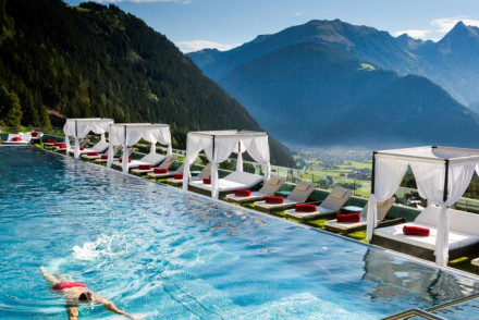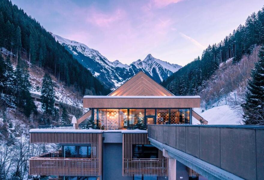 Set in the scenic heart of Mayrhofen, this luxury mountain resort blends alpine elegance with modern flair. The stylish, rustic-chic interiors have cosy touches throughout. Guests can indulge in the infinity pool, spa, and gourmet dining, or relax at the central bar. Perfect for a lively adventure.