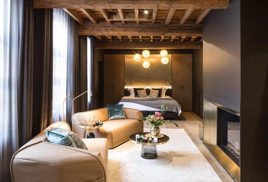 A former aristocrat's residence, this hotel sits in the heart of Bruges but is tucked away from the city buzz. Elegant rooms boast plush furnishings, sparkling chandeliers, and ornate ceilings — fit for a palace. There's a top restaurant, a luxe spa, plus a heated winter terrace. A hidden gem.
