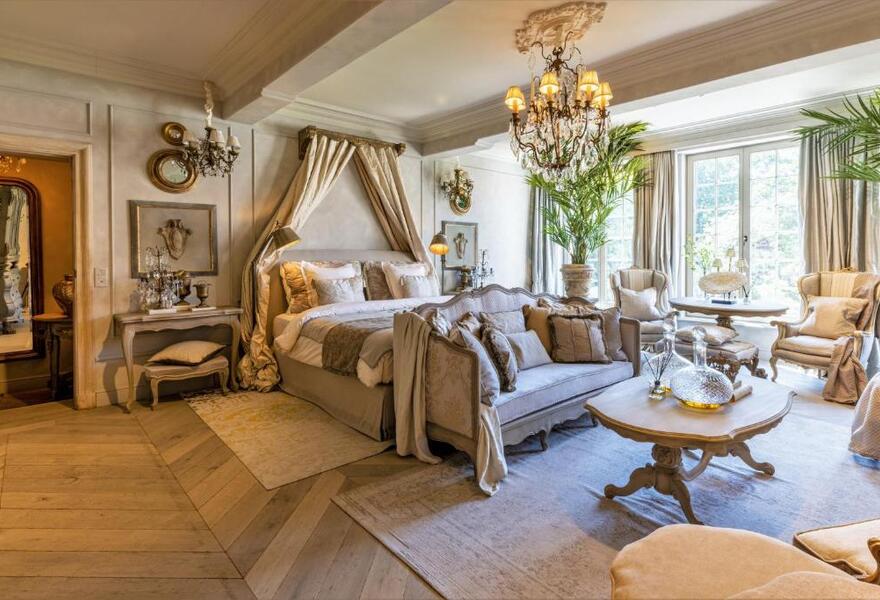 Historic 16th century listed building with classical rooms. Bedrooms, suites, and family rooms, all with noble themes, have marble mantlepieces, oak beams, four poster beds, romantic fabrics and wall papered walls. Stunning boxed hedge garden, bar and sitting room.