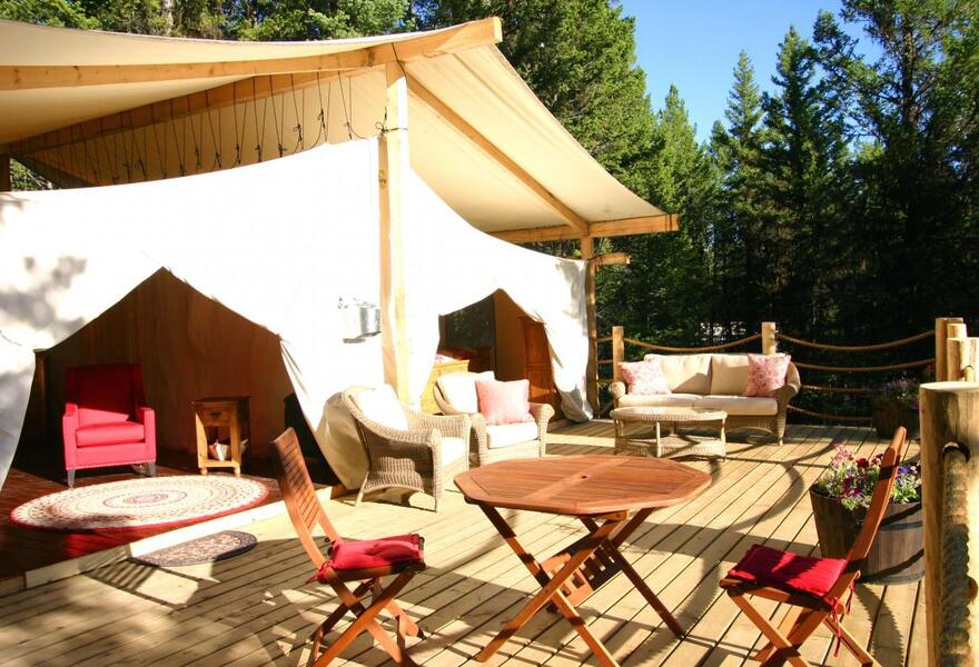 A stunning lodge and tented camps, in an outstanding remote location. Luxury tents are well proportioned with traditional fabrics, Egyptian cotton sheets and outdoor showers. Dine on exquisite farm fresh cuisine and spend days riding horses, hiking or fishing. A fabulous experience.