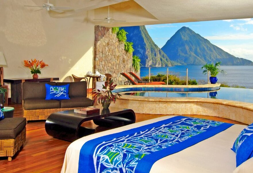 • Anse Chastanet is a 600-acre resort, with rooms scattered between the hillside and the beach front. Stay here for a classic Caribbean feel — without the air-conditioning or the high-tech gadgets of many modern resorts. With five restaurants, tennis courts, a gym, spa and complimentary watersports, there's no shortage of things to do! An eco-conscious choice focusing on the area's natural charms.