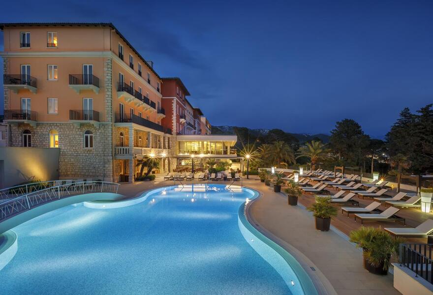 This renovated heritage hotel is nestled next to the historic centre of Rab. The best of the four-star suites have plush soft furnishings and sea views from the balcony. Relax on a sun lounger by the pool or hire rackets for a game on the hotel's own tennis courts. A luxury Mediterranean retreat.
