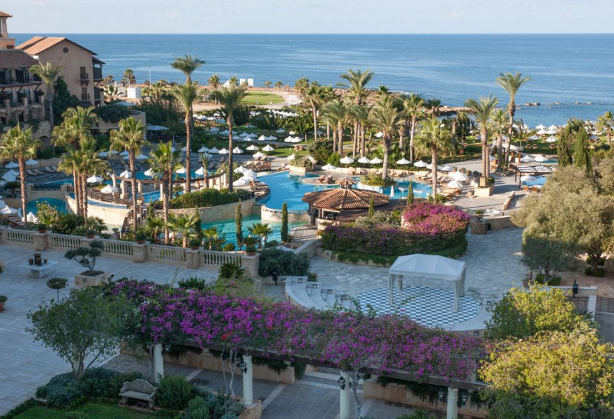 Elegant 5-star hotel on the Cyprian coast designed in a traditional style, with colonnades, cool marble floors, mosaics, terracotta tiles and waterfalls. It has a world-class spa, pools, tennis courts and a grand total of 5 restaurants, 2 bars and 1 cafe. Perfect for weddings or romantic getaways.