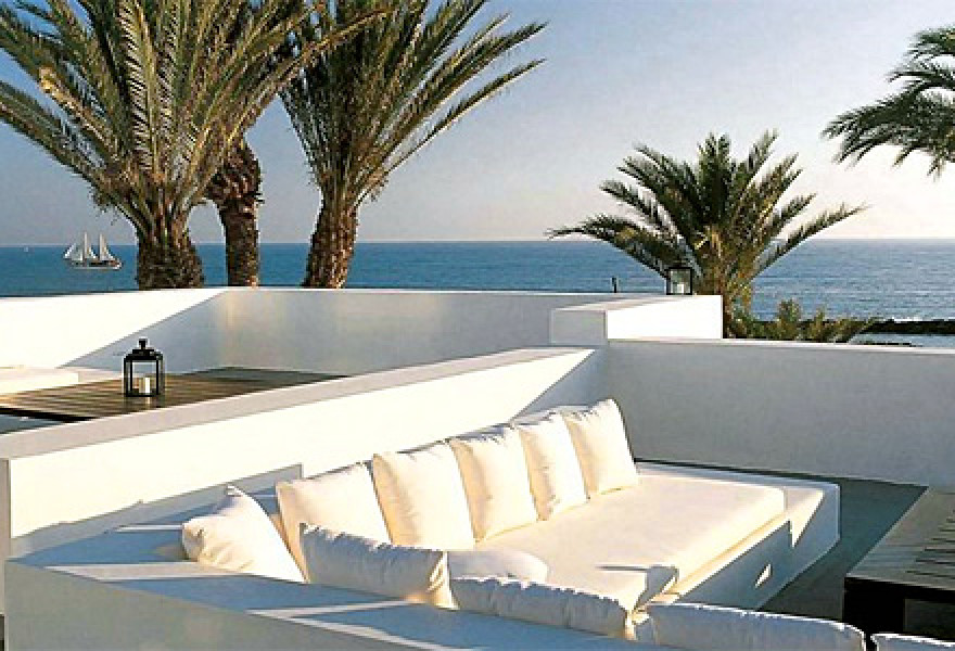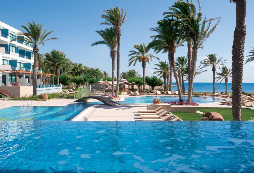 Chic Five Star luxury on the coast in Paphos. Stunning views, unique services, all white rooms and suites with balconies, roof terraces, excellent restaurants, beach access and extensive spa. Family friendly and super cool.
