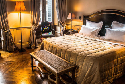 A delightful hotel set in a traditional 19th century house. Large rooms are contemporary with rich details; mahogany furniture, drapes and exposed beams, all with opulent bathrooms. Great classical French cuisine, lighter snacks from the cafe bistro, and a charming courtyard. Very romantic.