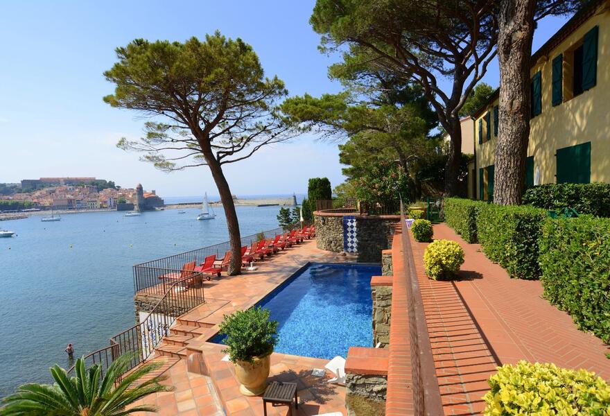 Dieses Vier-Sterne-Hotel liegt im Schatten von Pinienbäumen am Ufer des Mittelmeers in Collioure. Das traditionelle, mit Terrakotta geflieste Haus bietet einfache, aber elegante Gästezimmer mit Meerblick. Entspannen Sie sich am Pool auf der Terrasse des Hotels am Meer oder nehmen Sie die Treppe hinunter zum Kieselstrand.