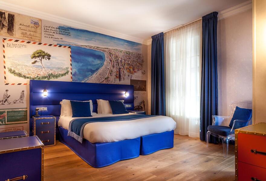 This four-star hotel is situated in the heart of Nice. The décor of the rooms draws inspiration from the neighbouring Nice-Ville train station, with postcard theme walls and travel trunk design pieces; book a family room for extra space. Enjoy a drink at the cosy courtyard bar; a charming hotel.