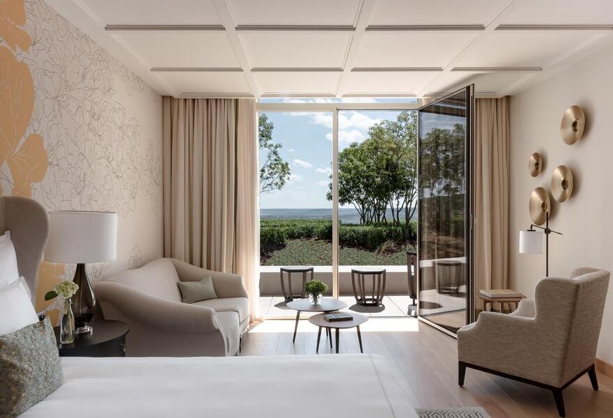 Ein modernes Hotel auf einem malerischen Hügel in der Nähe von Épernay. Die raumhohen Fenster vermitteln den Eindruck, den Wald und die Weinberge zu berühren, während natürliche Materialien wie Eichenholz, Wolle und Leinen eine beruhigende Atmosphäre schaffen. Die Brasserie, das Spa und der Pool machen das Hotel zu einem stilvollen Rückzugsort in der Natur.