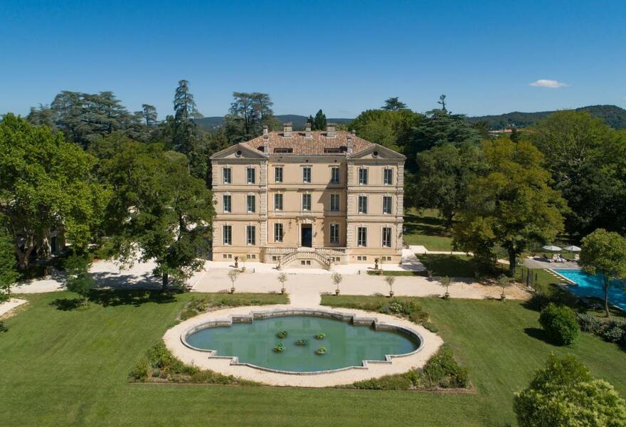 This grand hotel occupies a 19th-century château in bucolic grounds in Provence. The heritage facade gives way to frescoed ceilings and a sweeping staircase. Upstairs, guestrooms feature silk panels and bespoke furniture. A gourmet restaurant and outdoor pool complete this stylish country retreat.