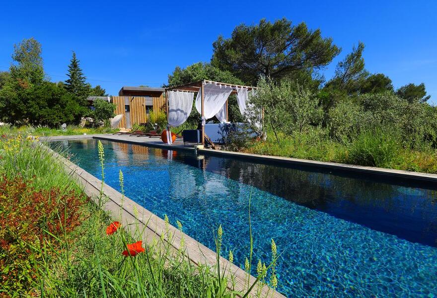 Lying a little outside Nimes, Bien Loin d'Ici feels like a quiet retreat into nature. The three double rooms have contemporary decor, en suite bathrooms which lead onto private terraces boasting views and private hot tubs. The outdoor heated pool set amongst wildflowers is absolute bliss. Superb!