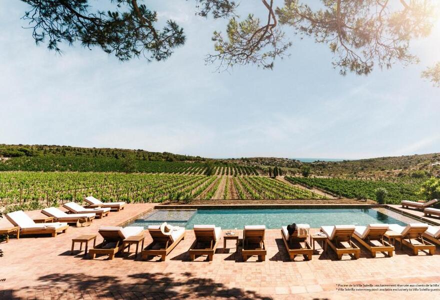 Ce complexe viticole est un havre de détente et de qualité de vie, au cœur du Languedoc. Les intérieurs allient charme rustique et élégance moderne, avec du bois naturel, des tons doux et des textures luxueuses. Les clients peuvent profiter du spa, de la cuisine gastronomique et de la vue sur les vignobles. Une escapade parfaite pour les amateurs de vin.