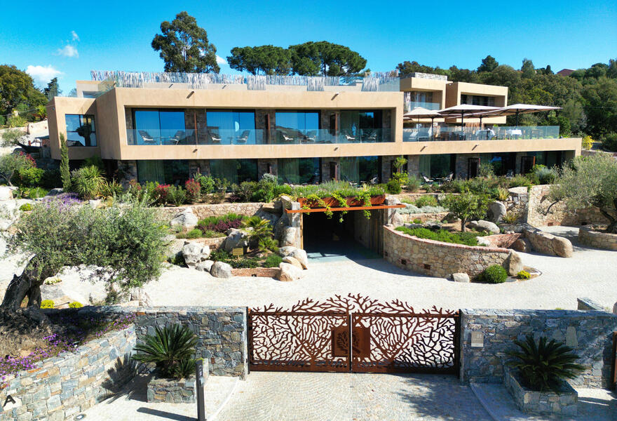 A peaceful estate surrounded by pine and olive trees on Corsica’s southern coast. The interiors combine eco-chic design with homely warmth, featuring natural tones and elegant touches. Guests can enjoy a fine-dining Corsican restaurant, a vinotherapy spa, and a heated pool. A relaxing coastal stay.