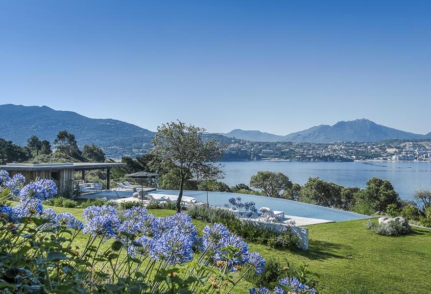 Stilvolle Villa an der korsischen Küste. Fünf lichtdurchflutete Zimmer mit eigenem Bad, modern gestaltet mit erröteten Möbeln und atemberaubender Aussicht. Täglich wird ein traditionelles, mediterranes Frühstück aus lokaler Produktion serviert. Die Gäste können am Strand entspannen, ein Sonnenbad am Pool nehmen oder den Panoramablick von der Terrasse aus genießen.