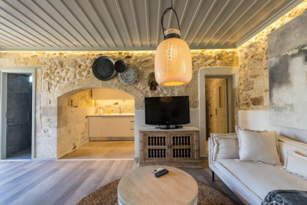 Un pressoir à olives rénové datant du XVIIIe siècle et les bâtiments environnants présentent une architecture crétoise simple : murs en pierre, arches et poutres en bois avec des intérieurs minimalistes-chic. Les chambres disposent de lits confortables, de canapés et de terrasses privées avec vue. L'hôtel sert une cuisine grecque contemporaine et dispose d'une grande piscine extérieure.