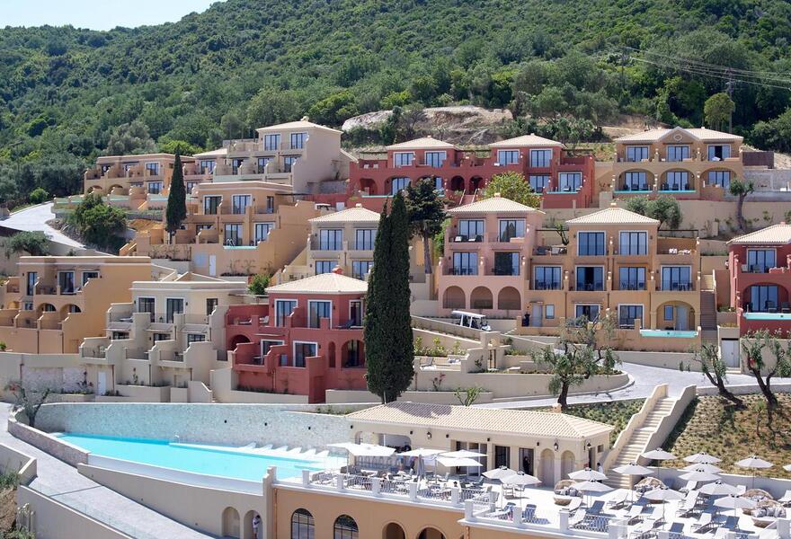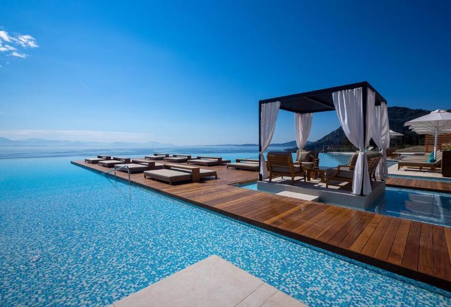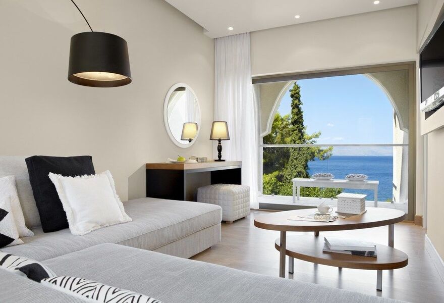 Ein luxuriöses Strandhotel mit Suiten mit Privatpools und großartiger Aussicht. Das terrassenförmige Design in korfiotischen Farben erinnert mit Bögen und Terrassen an das venezianische und griechische Erbe der Insel, während die Zimmer hell und stilvoll sind. Das Hotel bietet zwei Restaurants und einen Privatstrand - ein idealer romantischer Rückzugsort!