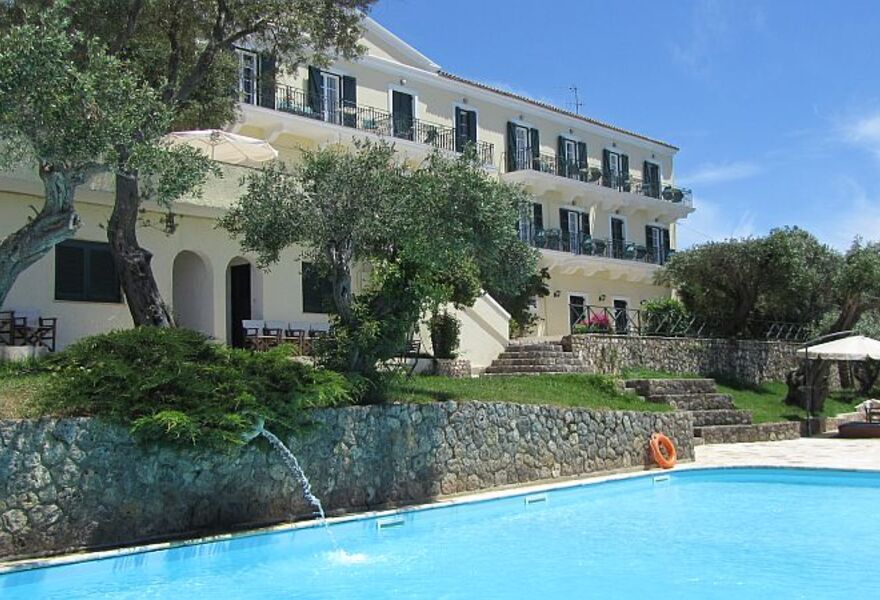 Schönes neoklassizistisches Hotel in den Hügeln oberhalb des Ionischen Meeres. Attraktives traditionelles Gebäude, charmante Zimmer mit Balkonen zum Meer, schöne Terrasse und Café sowie Swimmingpool. Eine preiswerte Wahl in unmittelbarer Nähe von Stränden, Golf und Korfu-Stadt. Geeignet für Paare, Familien und Gruppen.