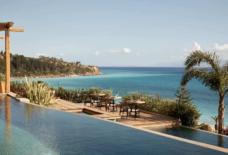 A sleek hotel on Kefalonia's shores surrounded by lush landscape. Elegant interiors highlight modern Grecian style with vibrant hues and natural textures. Guests can enjoy true indulgence with private pools in every suite, a spa, gourmet dining, and starlit poolside lounging. A slice of paradise.