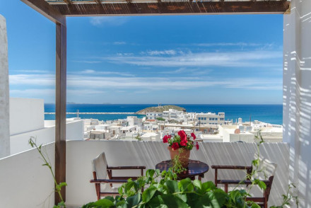The ultimate Naxos retreat in the heart of a typically Greek whitewashed town. Charming courtyard garden, art and family antiques. Cosy simple bedrooms, a few with balconies, and locally woven curtains and tablecloths. Close to a lovely beach with great views from terrace.