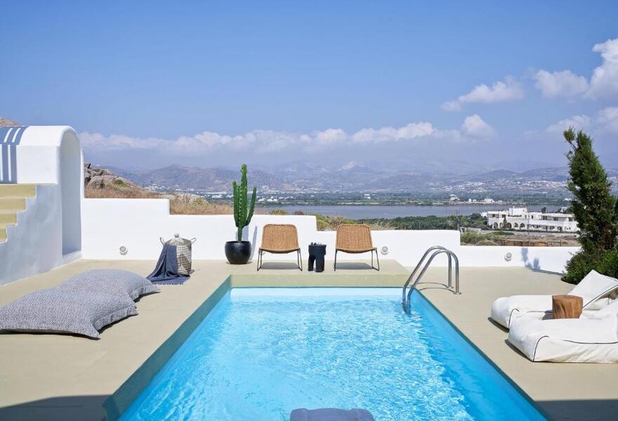 A serene boutique escape on Naxos, perched above Agios Prokopios with stunning salt lake views. Cycladic-style suites boast all-white interiors, Coco-mat beds, tadelakt baths, and private plunge pools. Enjoy a rooftop pool, spa, and fitness centre, plus easy beach access. Quiet luxury.
