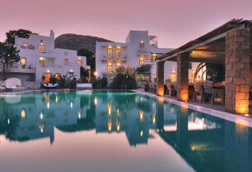 A boutique seaside retreat exuding laid-back luxury on the shores of Skyros. The sleek, Cycladic-inspired interiors mix whitewashed walls with natural stone and wooden accents. There's an infinity pool, beachfront dining, and a chic cocktail bar. An effortlessly cool, and perfectly peaceful escape.