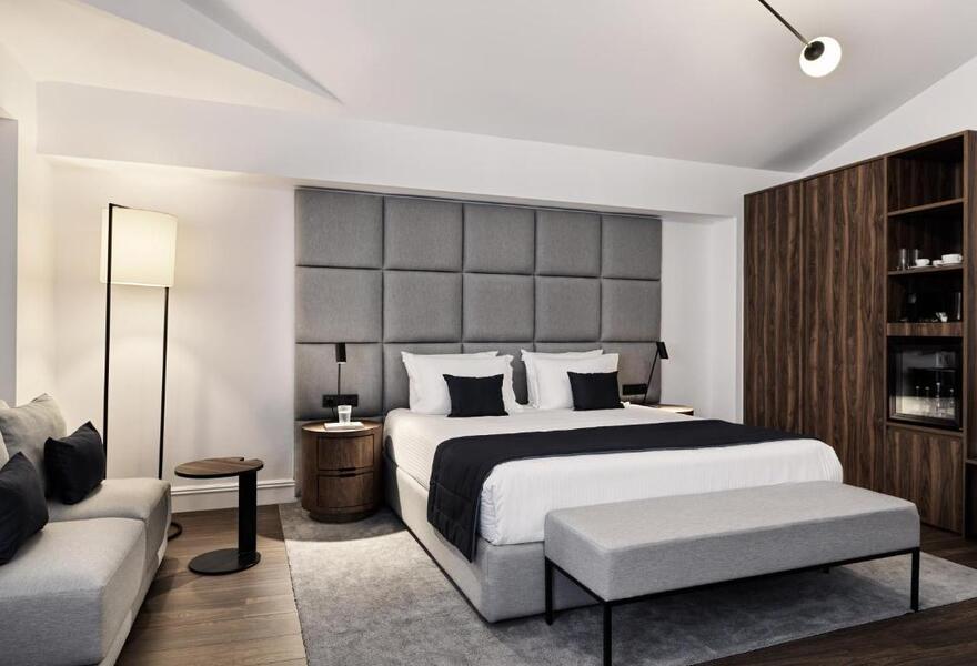 Nestled in the historical centre of Thessaloniki, this five-star boutique hotel offers luxury accommodation steps from the city's main attractions. A marble staircase leads to beautifully appointed guestrooms with hardwood floors and warm lighting. A rooftop champagne bar completes this luxury stay.