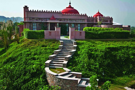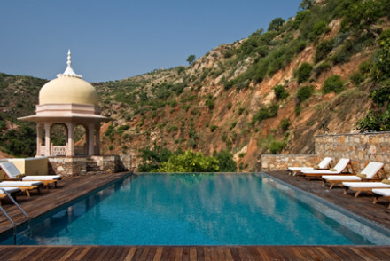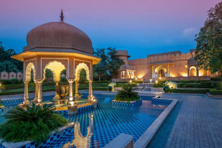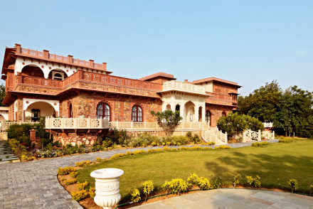 Ein traditioneller Rajput-Palast vor den Toren Jaipurs. Wunderbar romantische Zimmer und Suiten, alle individuell eingerichtet, aber jedes so zauberhaft wie das andere. Terrassen, Pools, Tennisplätze, Kamelsafaris, fantastische rajasthanische und europäische Küche. Königlich und luxuriös.