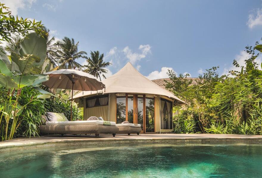 Sandat Glamping Tents enjoys a stunning forest location, a short distance from Ubud. This romantic spot offers luxurious private tents with chic furnishings and authentic Indonesian and Balinese cuisine. Escape from the heat with a refreshing dip in the pool. A magnificent retreat!