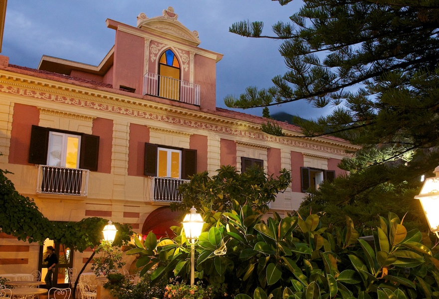 Die rosafarbene, cremefarbene Stuckvilla aus dem 19. Jahrhundert liegt in den Hügeln mit Blick auf das glitzernde Mittelmeer. Dieses charmante und vornehme Jugendstilhotel hat altmodische Werte und Stil. Hübsche, stufenförmig angelegte Gärten mit einer Fülle von Blumen erstrecken sich bis hinunter zum Kiesstrand. Ruhig und beschaulich