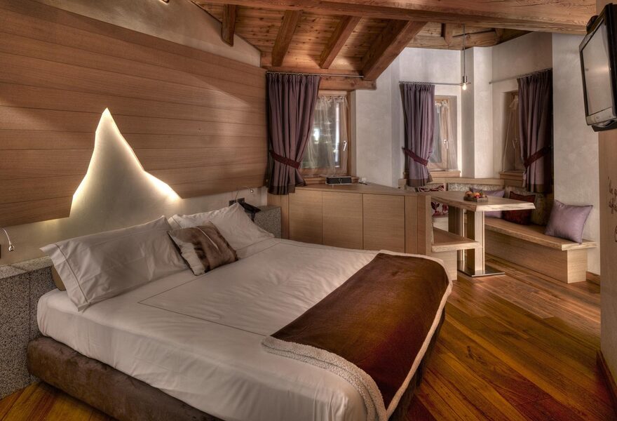 • The Hotel Chalet del Sogno is another charming chalet built from local stone and plenty of blonde wood. Its 18 rooms and suites are very spacious (family suites can easily accommodate up to 4 or 5), with plenty of pine detailing, and private balconies. The restaurant offers hearty, family-friendly fare in a welcoming atmosphere— ideal for groups as well as families, and there’s an excellent spa with a pool and sauna. Just 25 metres from the piste.