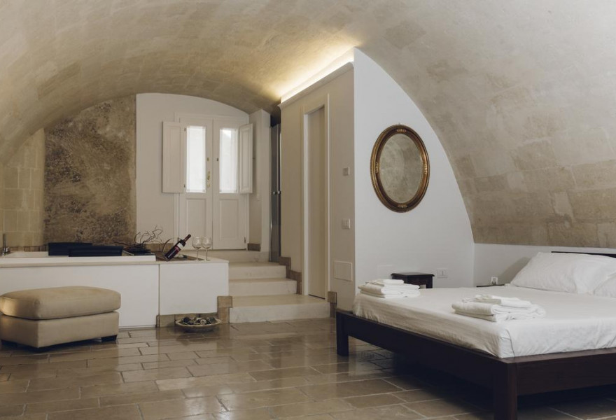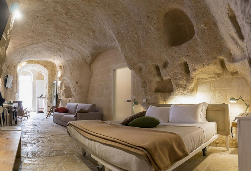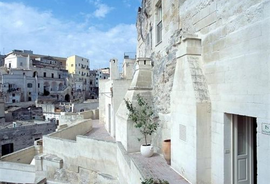 Designer hotel in the historic centre of Matera. Rooms blend bright minimalist styles with the ancient traditions of the "sassi" houses. Red wooden furniture is set against carved white limestone walls and all rooms boast views over the prehistoric caves of Matera. Ideal for history lovers.