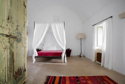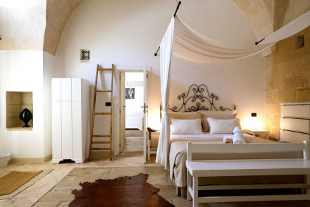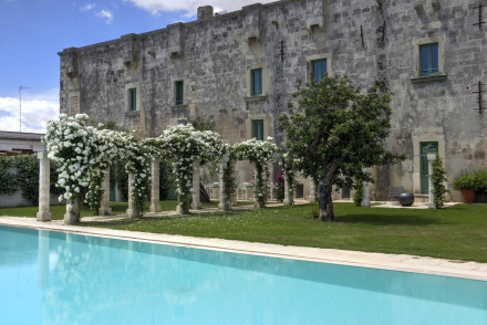 • Masseria Don Cirillo is a converted collection of farm buildings, this time close to Torre San Giovani and the west coast. Its six guest rooms are simply decorated, with whitewashed walls, stone vaulted ceilings and concrete floors covered with kilim rugs. The pool is set within a walled garden, beyond which olive groves spread. Relaxed and family friendly.
