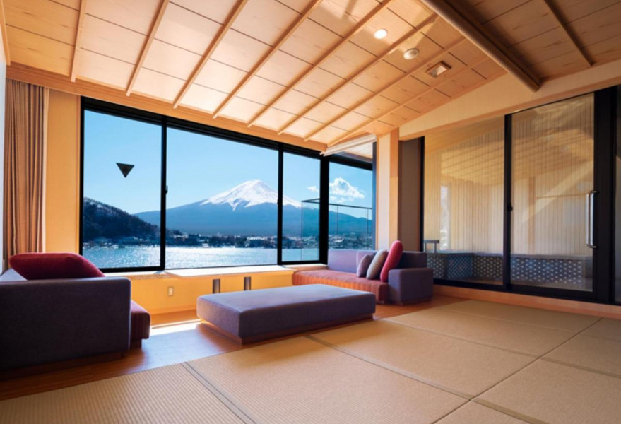 Ein luxuriöses Anwesen am Ufer des Kawaguchiko-Sees mit Blick auf den Berg Fuji. Die hellen, luftigen Zimmer sind eine Mischung aus westlichem und japanischem Stil; jedes Zimmer verfügt über ein eigenes Bad mit heißen Quellen. Zum Hotel gehören ein Restaurant mit regionalen Gerichten, ein Spa und eine Aussichtsplattform, von der aus man die spektakuläre Aussicht genießen kann.