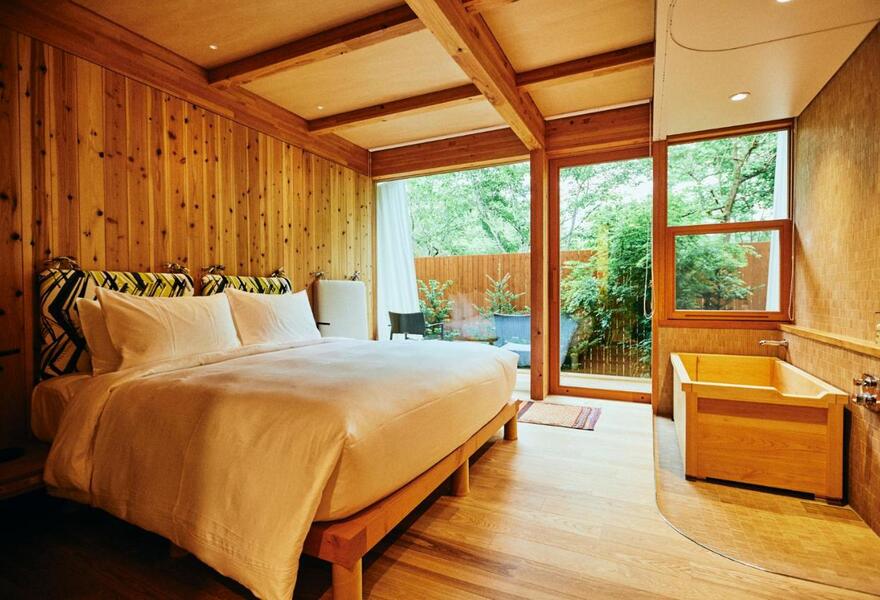A tranquil hotel surrounded by nature just over an hour from Tokyo. Airy rooms boast high ceilings and floors heated by hot springs, while the largest are spread over two floors. There's a spa, indoor and outdoor hot springs, and excellent local cuisine. The perfect spot for a rejuvenating getaway.