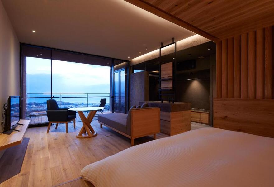 Cette propriété de luxe aux lignes épurées surplombe l'océan. Les chambres contemporaines sont dotées de fenêtres allant du sol au plafond, d'immenses terrasses et, pour les meilleures, d'un bain à remous. Le design mélange parfaitement les styles traditionnels japonais et contemporains. Un restaurant élégant sert des plats régionaux exemplaires. Fabuleux.