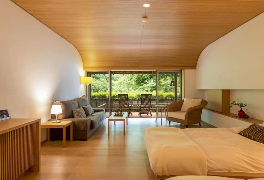 Un hôtel tranquille entouré par la nature à un peu plus d'une heure de Tokyo. Les chambres aérées sont dotées de hauts plafonds et de sols chauffés par des sources d'eau chaude, tandis que les plus grandes sont réparties sur deux étages. L'hôtel dispose d'un spa, de sources d'eau chaude intérieures et extérieures et d'une excellente cuisine locale. C'est l'endroit idéal pour une escapade rajeunissante.